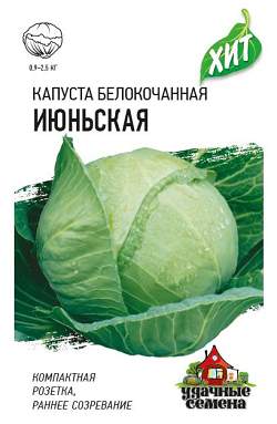 Капуста белокоч. Июньская (ранняя). Раннеспелый (до 117 дней от всходов до технической спелости) сорт. Розетка листьев мелкая, компактная, диаметром 40-50 см. Кочан округлый, светло-зеленый, массой 0,9-2,5 кг, среднеплотный. Наружная окраска светло-зеленая, на разрезе бело-желтая. Вкусовые качества отличные. Сорт характеризуется высокой урожайностью, хорошими товарными качествами кочанов. Рекомендован для употребления в свежем виде. Урожайность 3,6-6,4 кг/м?.
