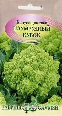 Капуста цветная Изумрудный кубок 0,2 г Н9. Скороспелый сорт сортотипа Романеско. Розетка листьев приподнятая. Листья среднего размера, серо-зеленые, слабопузырчатые. Головка оригинальной куполообразной формы, светло-зеленая, массой 350-500 г.