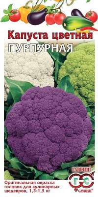 Капуста цветная Пурпурная 0,2 г. Среднеспелый (110-120 дней от всходов до технической спелости), высокоурожайный сорт с ценными диетическими свойствами. Головка округло-плоская, плотная, массой до 1,3-1,5 кг. Окраска насыщенная, фиолетово-пурпурная. Вкусовые качества высокие. Сорт характеризуется выровненностью головок, холодостойкостью, устойчивостью к ряду болезней.