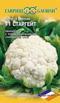 Капуста цветная Старгейт F1 10 шт. Ранний (72 дня от высадки рассады до сбора урожая) урожайный гибрид. Розетка листьев приподнятая. Головка среднего размера, частично покрытая, округло-плоская, среднебугристая, беловатая, средней плотности, массой 1,8 кг. Вкусовые качества и внешний вид головок отличные. Рекомендован для переработки и заморозки. Урожайность до 6,9 кг/м2. Посев на рассаду — в середине апреля. Пикировка — в фазе семядолей. Высадка в грунт — в середине мая по схеме 30х50 см.