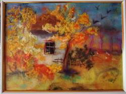 Картина Домик. Сегодня существует очень много техник живописи: углем, маслом, акрилом, пастелью и мелками. Но каждый век приносит что-то новое. Например, шерстяная акварель, которая занимает в этом ряду особое место. Во-первых, этот вид рукоделия нельзя отнести ни к мозаике, ни к ткачеству, ни к живописи. Оказалось, что материал, из которого раньше делали только валенки и платки, в умелых руках может стать предметом искусства. Кстати, сама техника валяния из шерсти очень древняя. Первым подобным изделиям, которые нашли археологи, более восьми тысяч лет.