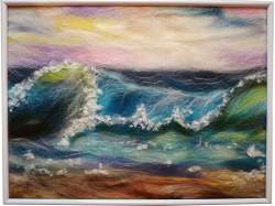 Картина Море. Сегодня существует очень много техник живописи: углем, маслом, акрилом, пастелью и мелками. Но каждый век приносит что-то новое. Например, шерстяная акварель, которая занимает в этом ряду особое место. Во-первых, этот вид рукоделия нельзя отнести ни к мозаике, ни к ткачеству, ни к живописи. Оказалось, что материал, из которого раньше делали только валенки и платки, в умелых руках может стать предметом искусства. Кстати, сама техника валяния из шерсти очень древняя. Первым подобным изделиям, которые нашли археологи, более восьми тысяч лет.