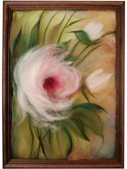 Картина Пион. Сегодня существует очень много техник живописи: углем, маслом, акрилом, пастелью и мелками. Но каждый век приносит что-то новое. Например, шерстяная акварель, которая занимает в этом ряду особое место. Во-первых, этот вид рукоделия нельзя отнести ни к мозаике, ни к ткачеству, ни к живописи. Оказалось, что материал, из которого раньше делали только валенки и платки, в умелых руках может стать предметом искусства. Кстати, сама техника валяния из шерсти очень древняя. Первым подобным изделиям, которые нашли археологи, более восьми тысяч лет.
