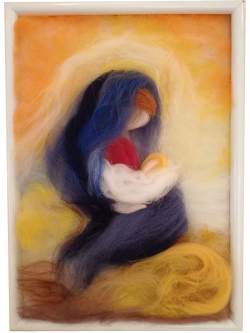 Картина Рождество. Сегодня существует очень много техник живописи: углем, маслом, акрилом, пастелью и мелками. Но каждый век приносит что-то новое. Например, шерстяная акварель, которая занимает в этом ряду особое место. Во-первых, этот вид рукоделия нельзя отнести ни к мозаике, ни к ткачеству, ни к живописи. Оказалось, что материал, из которого раньше делали только валенки и платки, в умелых руках может стать предметом искусства. Кстати, сама техника валяния из шерсти очень древняя. Первым подобным изделиям, которые нашли археологи, более восьми тысяч лет.