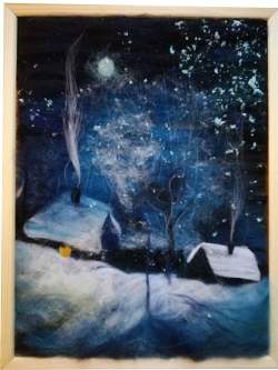 Картина Самая длинная ночь. Сегодня существует очень много техник живописи: углем, маслом, акрилом, пастелью и мелками. Но каждый век приносит что-то новое. Например, шерстяная акварель, которая занимает в этом ряду особое место. Во-первых, этот вид рукоделия нельзя отнести ни к мозаике, ни к ткачеству, ни к живописи. Оказалось, что материал, из которого раньше делали только валенки и платки, в умелых руках может стать предметом искусства. Кстати, сама техника валяния из шерсти очень древняя. Первым подобным изделиям, которые нашли археологи, более восьми тысяч лет.