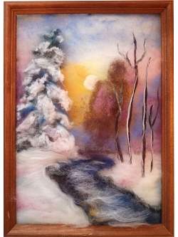 Картина Самый короткий день. Сегодня существует очень много техник живописи: углем, маслом, акрилом, пастелью и мелками. Но каждый век приносит что-то новое. Например, шерстяная акварель, которая занимает в этом ряду особое место. Во-первых, этот вид рукоделия нельзя отнести ни к мозаике, ни к ткачеству, ни к живописи. Оказалось, что материал, из которого раньше делали только валенки и платки, в умелых руках может стать предметом искусства. Кстати, сама техника валяния из шерсти очень древняя. Первым подобным изделиям, которые нашли археологи, более восьми тысяч лет.