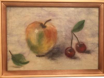 Картина Яблоко и вишни. Сегодня существует очень много техник живописи: углем, маслом, акрилом, пастелью и мелками. Но каждый век приносит что-то новое. Например, шерстяная акварель, которая занимает в этом ряду особое место. Во-первых, этот вид рукоделия нельзя отнести ни к мозаике, ни к ткачеству, ни к живописи. Оказалось, что материал, из которого раньше делали только валенки и платки, в умелых руках может стать предметом искусства. Кстати, сама техника валяния из шерсти очень древняя. Первым подобным изделиям, которые нашли археологи, более восьми тысяч лет.