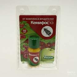 Кемифос (10 мл.). От комплекса вредителей на плодовых и ягодных культурах, универсальный препарат для ранневесенней обработки от комплекса вредителей. Кемифос относится к несистемным фосфорорганическим инсекто-акарицидам, обладает контактным, кишечным и фумигантным действием. Основное применение — инсектицид для сельского хозяйства. Действующее вещество малатион ингибирует фермент ацетилхолинестеразу.