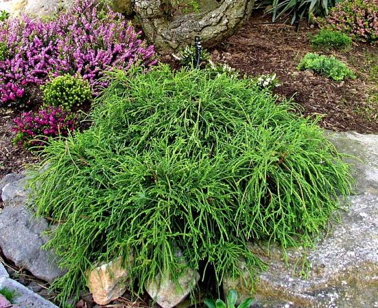 Кипарисовик Filifera Nana (Филифера Нана). Кустарник, достигающий 0,5 м в высоту и 2 м в диаметре. Годовой прирост около 10 см. Характеризуется интересной формой в виде плоского купола и верёвкообразными зелёными побегами. Крона округлая с восходящими поникающими концами веток.