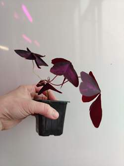 Кислица треугольная. Очаровательное растение, очень легкое в уходе. Листья треугольные, трепетные, будто крылья бабочки. Очень красивого темно-бордового цвета. Активно отращивает листья и цветет светло-сиреневыми колькольчатыми цветками в течение весны и до глубокой осени.