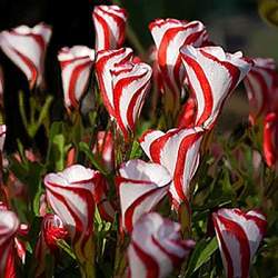 У оксалиса версиколор изящные бледно-зеленые листики. Они превращают кустик растения в пушистый зеленый ежик. Очень интересны цветки у этого сорта. Бутоны размером около 2 см выглядят полосатыми, красно-белыми, а когда цветок полностью раскрывается, он снаружи красный, а внутри белый.