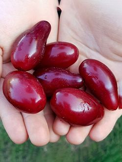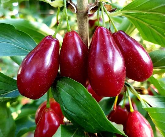 Кизил Мас. Листопадный кустарник высотой 300 см. Ветви горизонтально распростёртые, листья овальные, блестящие, ярко-зелёные. Плод — удлинённо-овальная сочная костянка, окраска от светло-красной до почти чёрной. Средняя масса плода 2-6 г. Плоды созревают с конца августа — в сентябре.