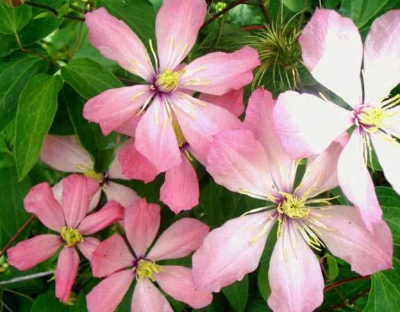 На одном цветке насчитывается 5-6 шт. чашелистиков холодного розового цвета с иссиня-фиолетовым основанием. По мере цветения лепестки постепенно бледнеют практически до молочно-белого оттенка. Цветки крупные, достигают в диаметре 15 см. Сердцевина — пыльник яркого жёлтого цвета.