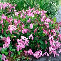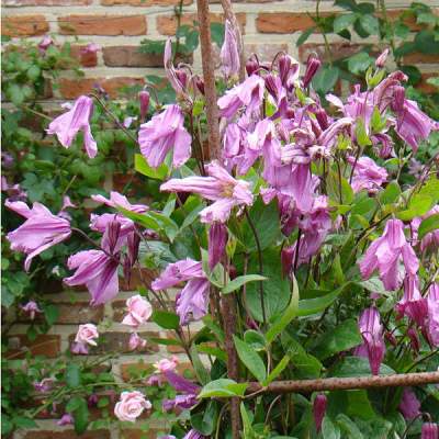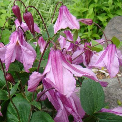 Клематис Алёнушка. Прекрасное растение с фантастическими, колокольчиковидными, тёмно-розовыми цветками. Побеги приподнятые, не цепляющиеся за опоры (как плетистые розы). Оставленный без опор стелется по земле. Красиво переплетается с другими растениями. Устойчив. Особенно хорош как почвопокровное или балконное растение.