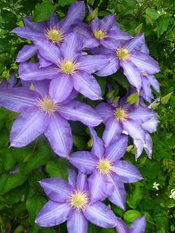 Клематис Анна Герман. Голубые с фиолетовым оттенком и светлой полосой на лепестках цветы (12-20 см). Группа обрезки 2 (слабая). Другие названия Anna Hermann, Благодать.