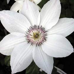 Клематис Anna Karolina (Анна Каролина). Польский сорт с белыми цветками с пурпурными пыльниками на белых тычиночных нитях. Цветёт обильно весной и повторяет цветение в конце лета. Нуждается в слабой обрезке. Хорош для посадки у оград, беседок, решёток и других садовых опор. Может виться по натуральным опорам, например, кустарникам или полукустарникам.