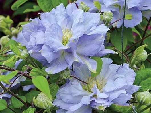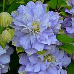 Клематис Azure Ball (Азур Болл). Восхитительный сорт с огромными голубыми цветками. Цветет с мая до конца июля. На прошлогодних побегах цветки махровые, на молодых — простые. Высота 200 см. Любит места в ажурной тени. Цепляется за опоры листовыми черешками. Хорошо для контейнеров.