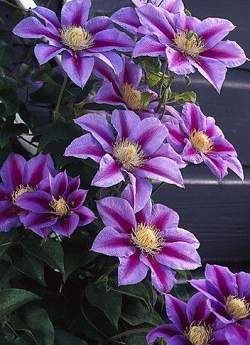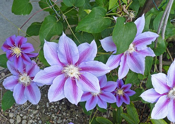 Клематис Barbara Jackman (Барбара Джекман). Цветы раскрытые 12-18 см в диаметре, заостренно-эллиптические, сиренево-розовые со сливового цвета полосой по центру. Пыльники кремовые. Цветет в конце мая-июне на побегах прошлого года, затем до сентября — на побегах текущего года. Не выгорает.