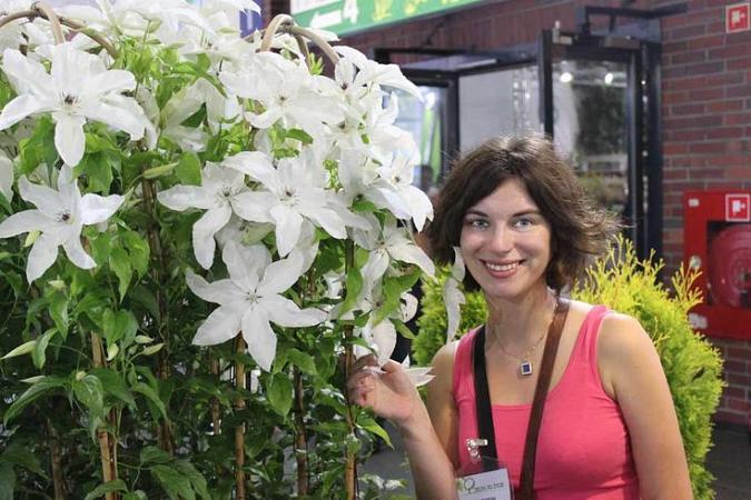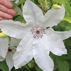 Клематис Beautiful Bride (Бютифул Браид). У этого клематиса белые цветки очень большого размера (диаметр до 28 см). Цветет обильно в мае-июле, затем цветение повторяется, но слабее. Высота побегов достигает 2-3 м. Клематис не любит ветренных участков, очень солнечных или жарких. Морозостойкое растение.