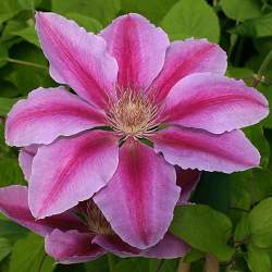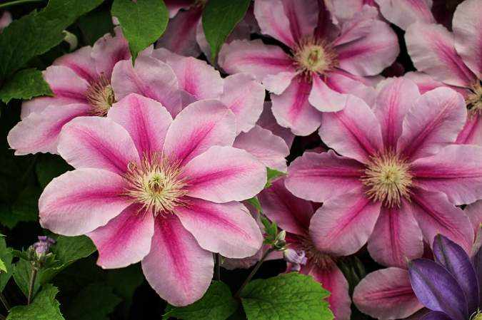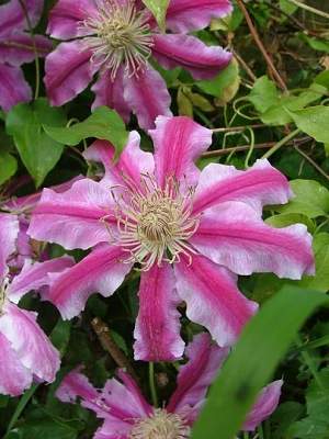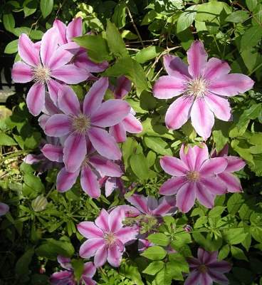 Клематис Bees Jubilee (Биз Джубили). Цветки лилово-розовые с тёмно-розовой полоской и светло-коричневыми тычинками. Цветение: май, июнь и повторно сентябрь. В местах солнечных цветки блекнут. Умеренно растущий. Цепляется за опоры листовыми черешками. Используется для посадки у всех садовых опор, решёток или среди кустарников. Особенно хорош для использования в полутенистых местах.