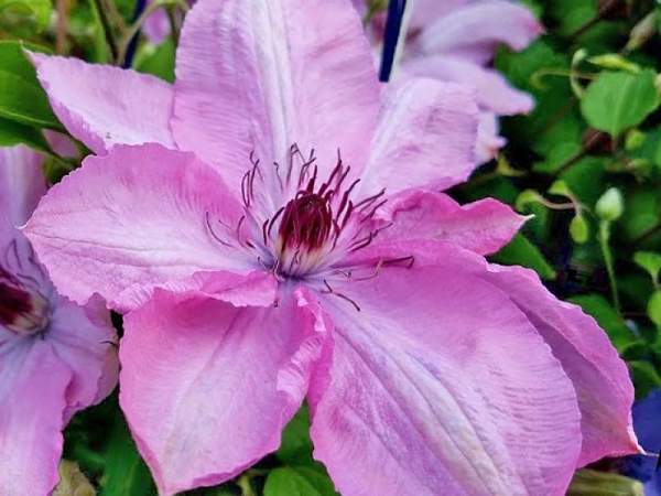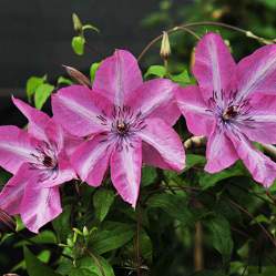 Клематис Bieszczady (Бешчады). Цветки розовые со светлой, почти белой полосой посередине лепестков. Цветки диаметром 14-20 см, с 6-8 лепестками. Пыльники бордовые на розовых тычиночных нитях. Цветёт с конца июня дo сентября. Достигает высоты 2-3 м. Цепляется за опоры листовыми черешками. Используется для посадки у оград, беседок, сеток, решёток и других садовых опор. Обрезка сильная (3 группа).