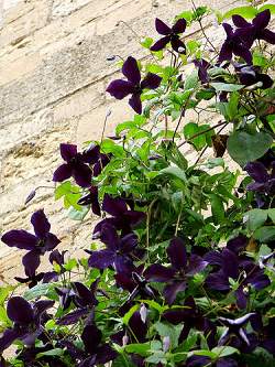Клематис Black Prince (Блэк Принц). Эффектный и легкий в выращивании. Цветки темно-пурпурные, тычинки пурпурные. Хорош в качестве компаньона для плетистой розы, идеально подходит для отдельно стоящей шпалеры и т.д. Предпочитает солнечные и полузатененные места с хорошо дренируемой почвой. Высота 2,5-3 м. Зона зимостойкости: 4.