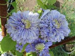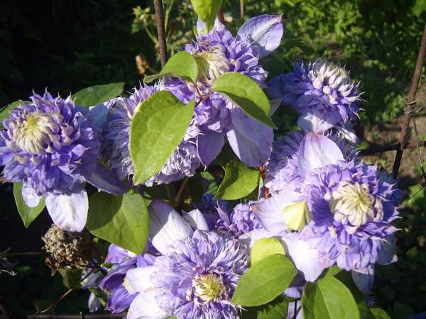 Клематис Blue Light (Блу Лайт). Цветки крупные, светлые, лавандово-голубые. Цветет махровыми цветками как на старых, так и на новых побегах. Цветки без запаха. Цепляется за опоры листовыми черешками.