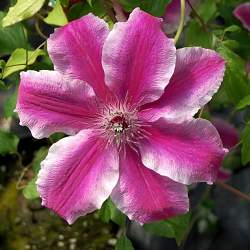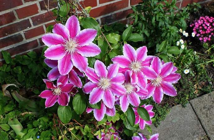Клематис Carnaby (Карнаби). Умеренно растущий сорт с двуцветными цветками: клубнично-красными с белыми краями и красными тычинками. Не любит очень солнечных жарких мест. Для выращивания у оград, стен, беседок, решёток. Может карабкаться по натуральным опорам, например, небольшим деревьям и кустарникам.