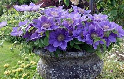 Клематис Bijou (Бижу). Уникальный карликовый сорт, длина плетей всего 30-40 см. Цветки светло-фиолетовые, 10-12 см в диаметре. Цветет чрезвычайно обильно. Хорош как почвопокровное растение. Также замечательно смотрится в вазонах. Корневая система компактная, поэтому можно выращивать даже на балконе в горшке среднего размера.