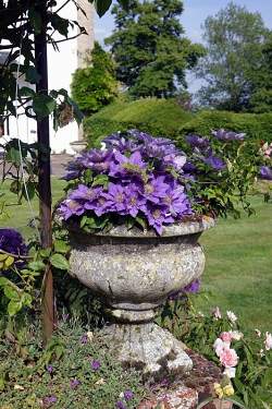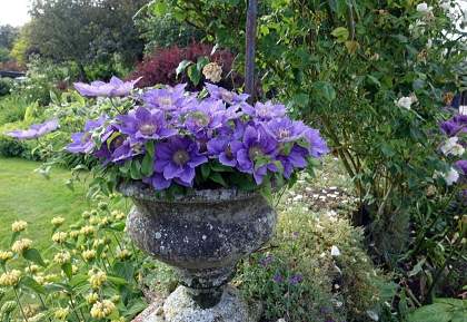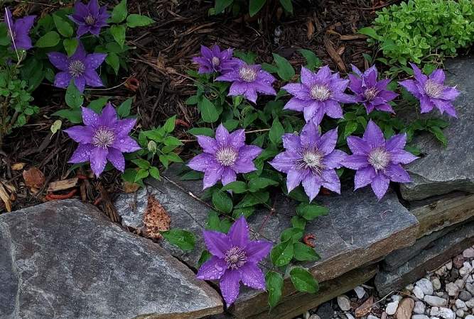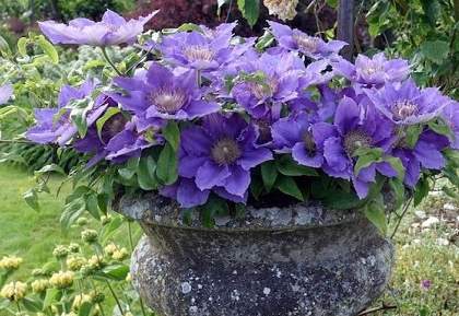 Клематис Bijou (Бижу). Уникальный карликовый сорт, длина плетей всего 30-40 см. Цветки светло-фиолетовые, 10-12 см в диаметре. Цветет чрезвычайно обильно. Хорош как почвопокровное растение. Также замечательно смотрится в вазонах. Корневая система компактная, поэтому можно выращивать даже на балконе в горшке среднего размера.