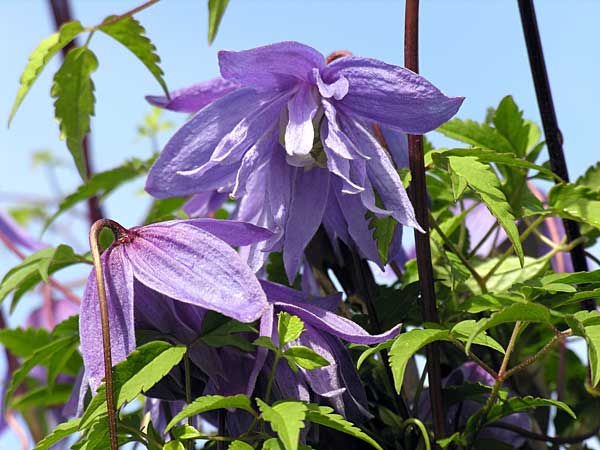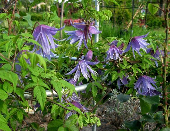 Клематис Cecile (Сесиль). Цветки красивые, полумахровые, фиолетово-голубые. Цветёт весной на прошлогодних побегах. С июня до осени украшен пушистыми соплодиями. Выносит полутень.