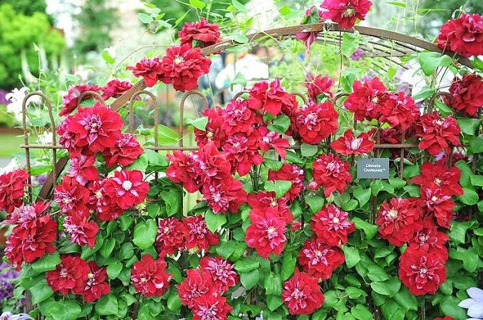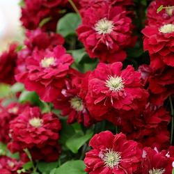Клематис Charmaine (Чармейн). Новинка 2017 года. Цветки ярко-малиновые, до 15 см в диаметре. Цвет очень насыщенный. Одновременно на одном растении распускаются простые, махровые и полумахровые цветки.