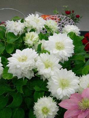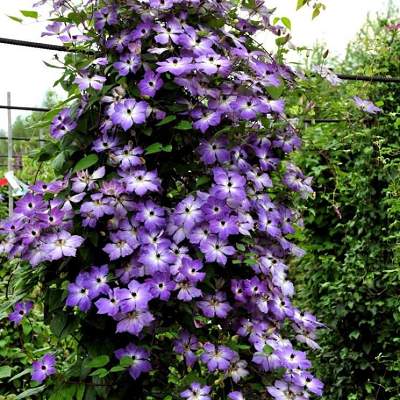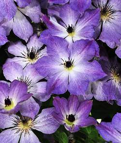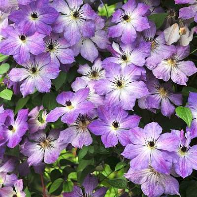 Клематис Cloudburst (Клаудбёрст). Цветки диаметром 10-12 см, интригующего светлого розовато-фиолетового цвета с белой серединкой с розовыми прожилками. Лепестки в количестве 4-6, ромбические, заострённые, в волнистыми краями, снизу светло-розовые с тёмной полоской по центру. Тычинки красивые, пыльники тёмные фиолетово-пурпурные, почти чёрные, тычиночные нити кремовые.