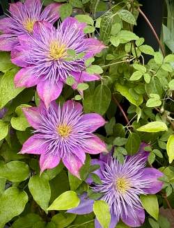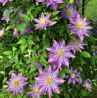 Клематис Crystal Fountain (Кристал Фаунтин). Очень красивый сорт японской селекции с махровыми сиреневыми цветками 10-12 см. Высота лианы 200 см. Цветение обильное с июня до середины августа, затем более слабое до конца сентября. Молодые побеги зелёно-пурпурные. Может подниматься по натуральным опорам (например, большой кустарник или дерево).