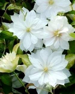Клематис Dancing Dorien (Дансин Дорин). Цветки белые махровые и на побегах прошлого года, и на побегах текущего года. Цветение на побегах прошлого года с мая по июль, на побегах текущего года с июля до заморозков.