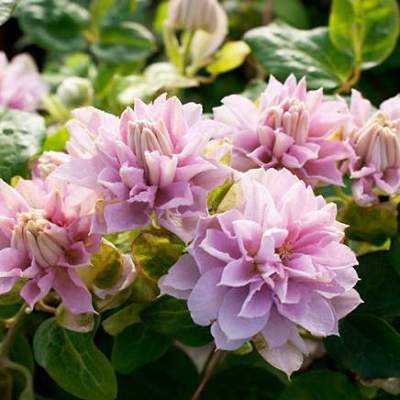 Клематис Dancing Smile (Дэнсин Смайл). Крупноцветковый гибрид. Цветки диаметром 6-8 см, розовато-сиреневые, весной шаровидные, при втором цветении более открытые. Цветёт в мае-июне на прошлогодних побегах и в июле-августе на побегах текущего года. Высота 200 см. На зиму в средней полосе требуется укрытие.