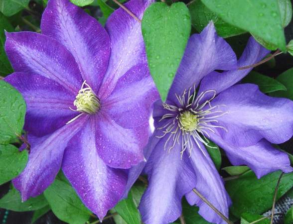Клематис Daniel Deronda (Даниэль Деронда). Прекрасный сорт. Цветки очень большие, синие, в мае-июне полумахровые, летом — простые. Тычинки кремово-жёлтые. Особенно подходит для использования в хорошо освещённых местах на светлом фоне.