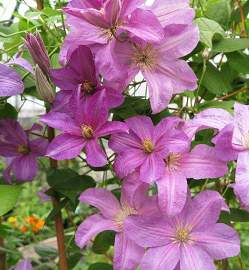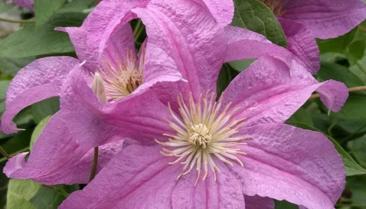 Клематис Danuta (Данута). Польский сорт, выведенный в начале 90-х годов Стефаном Франчаком (Stefan Franczak). Цветки розовые, со слегка волнистыми краями лепестков и кремово-зелёными тычинками. Цветёт обильно в июне-июле.