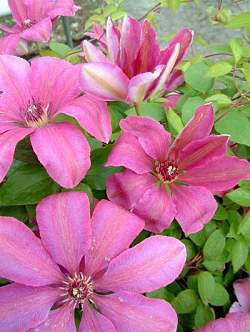 Клематис Debutante (Дебютант). Крупноцветковый гибрид, цветущий на побегах прошлого и текущего года. Цветки диаметром 10-12 см, иногда до 20 см, розовые. Цветёт в мае-июне на прошлогодних побегах и более слабо в июле-августе на побегах текущего года. Высота 200 см. Предпочитает тенистые места. На зиму в средней полосе требуется укрытие.