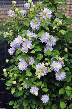 Клематис Diamond Ball (Даймонд Болл). Польский сорт селекции Щепана Марчиньского, в продаже с лета 2012 г. Цветки диаметром 10-12 см, бело-голубые, махровые, шарообразные. А в период полного цветения — полумахровые (30-50 чашелистиков) как на старых, так и новых побегах .
