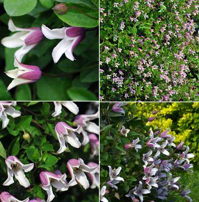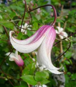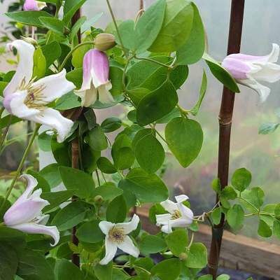 Клематис Elf (Эльф). Интригующий сорт, покрывающийся летом массой мелких (диаметром 4-5 см) колокольчатых цветков с четырьмя отгибающимися наружу чашелистиками, белыми внутри и розово-сиреневыми снаружи. Пыльники розово-белые, тычинки черные.