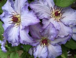 Клематис Extra (Экстра). Цветы лавандово-голубые, с гофрированной "оборочкой". Эффектные темно-пурпурные пыльники. Обильное цветение. 3 группа обрезки.