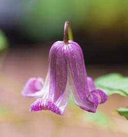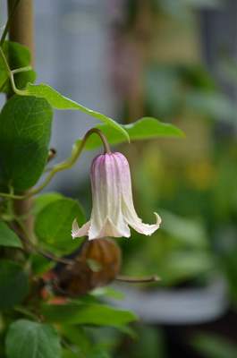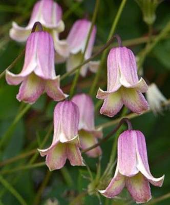 Клематис Fay (Фэй). Цветки диаметром 2-3 см, в виде колокольчиков, свисающих вниз, состоят из 4-х светло-розовых лепестков со светлым краем, очень сильно вывернутым наружу. Лепестки снаружи слегка гофрированные, внутри розово-кремовые с розовыми прожилками. Тычинки с жёлтыми пыльниками на белых тычиночных нитях.