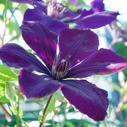 Клематис Gipsy Queen (Джипси Квин). Крупные (15 см) темно-пурпурно-фиолетовые цветы, бархатистые, с крупными пурпурными пыльниками, слабо выгорают на солнце. Один из красивейших клематисов для второй половины лета. Третья группа обрезки (сильная). При сохранении прошлогодних побегов цветение наступает раньше.