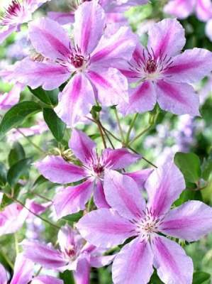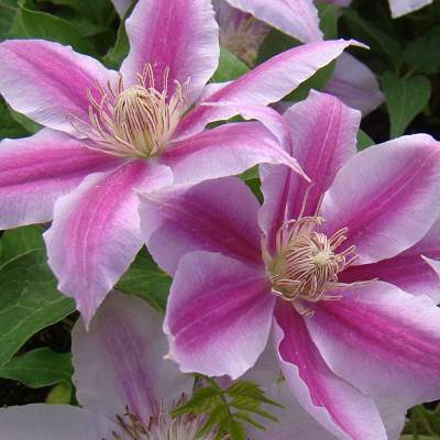 Клематис Girenas (Гиренас). Литовский сорт со светло-розовыми цветками диаметром до 20 см, с розово-красной полоской посередине чашелистиков и размытой окантовкой по краям. Тычинки с пурпурными пыльниками на белых нитях. Наиболее интенсивно цветет в июне и в начале июля, а менее обильно до начала сентября. Достигает высоты 3 м. За опоры цепляется листовыми черешками.