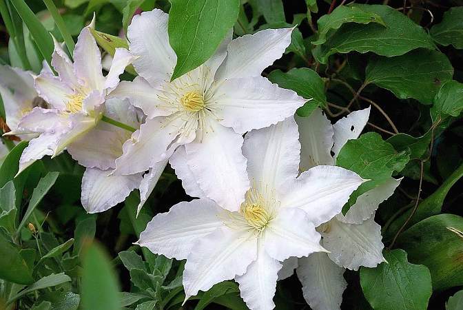 Клематис Gladys Picard (Глэдис Пикард). Крупные цветы с большими, волнистыми по краям, бледно-лиловыми лепестками и белой полосой в середине каждого лепестка. Пыльники кремово-желтые, цветы в полном роспуске выгорают до почти белого цвета. Обильно цветет в мае-июне и повторно в сентябре.