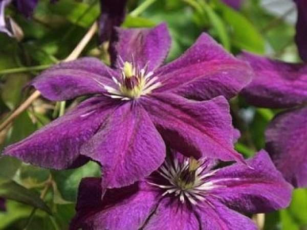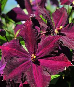 Клематис Grunwald (Грюнвальд). Самый новый польский сорт питомника Шчепана Марчинского, с тёмными фиолетово-пурпурными, как аксамит цветками диаметром 10-12 см. Лепестки в виде ромба, заостренные, темно-фиолетовые с розовой полоской по центру. У тычинок фиолетово-пурпурные пыльники на зелёно-кремовых нитках.