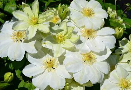Клематис Guernsey Cream (Дженси Крим). Цветет чрезвычайно обильно с середины мая до июля, повторяет цветение в конце августа. Цветки изначально светло-жёлтые, с зеленоватой полоской посередине, при распускании белеют. Тычинки жёлтые.