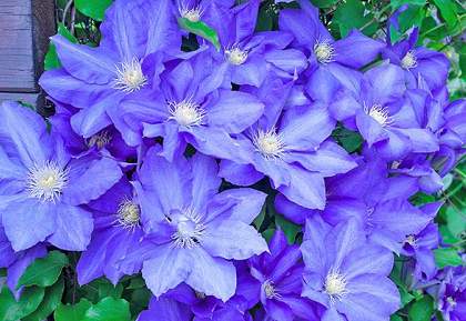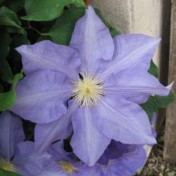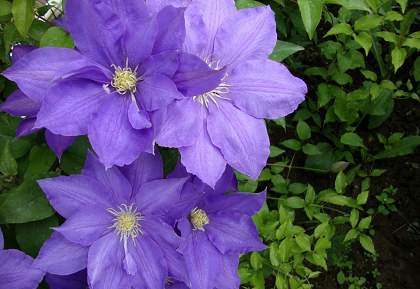 Клематис H.f. Young (Х.Ф. Янг). Цветки достигают 15-18 см в диаметре. В первую волну цветения в мае-июне цветет одиночными или полумахровыми цветками. Во вторую — только простыми. Высота взрослого растения 2-3 метра. Предпочитает суглинистые почвы и защищенные от холодных ветров уголки сада.