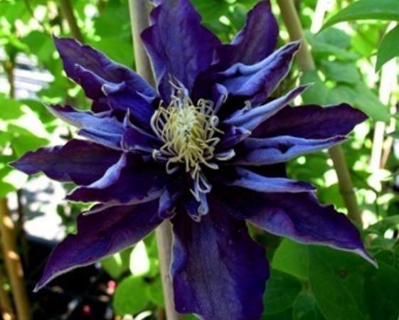 Клематис Hakuookan (Хакуокан). Очень оригинальный японский сорт с фиолетовыми цветками и пучком кремовых, исключительно длинных тычинок в центре. Компактный сорт, хорош для выращивания в контейнерах.